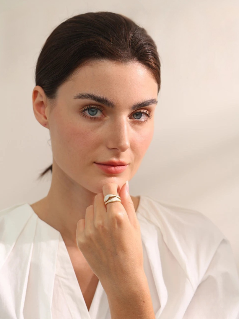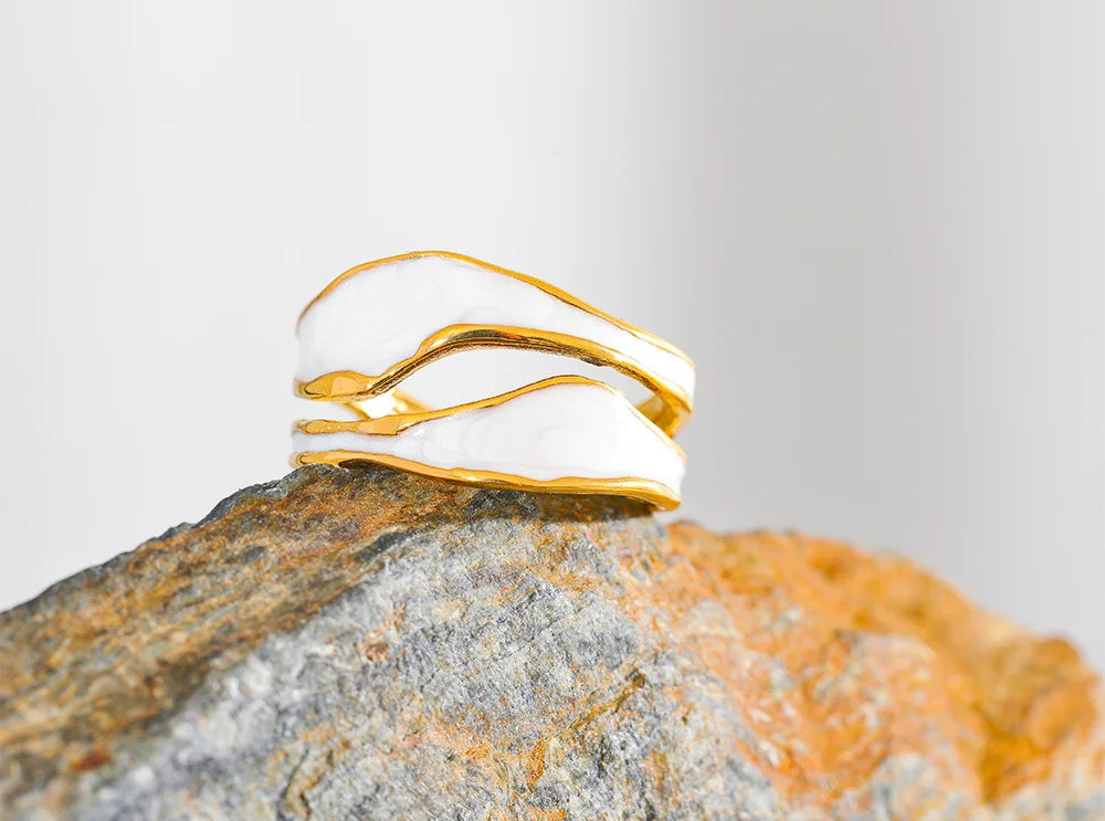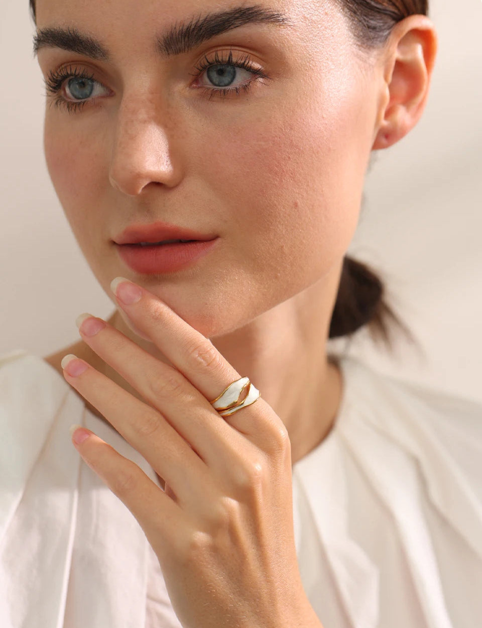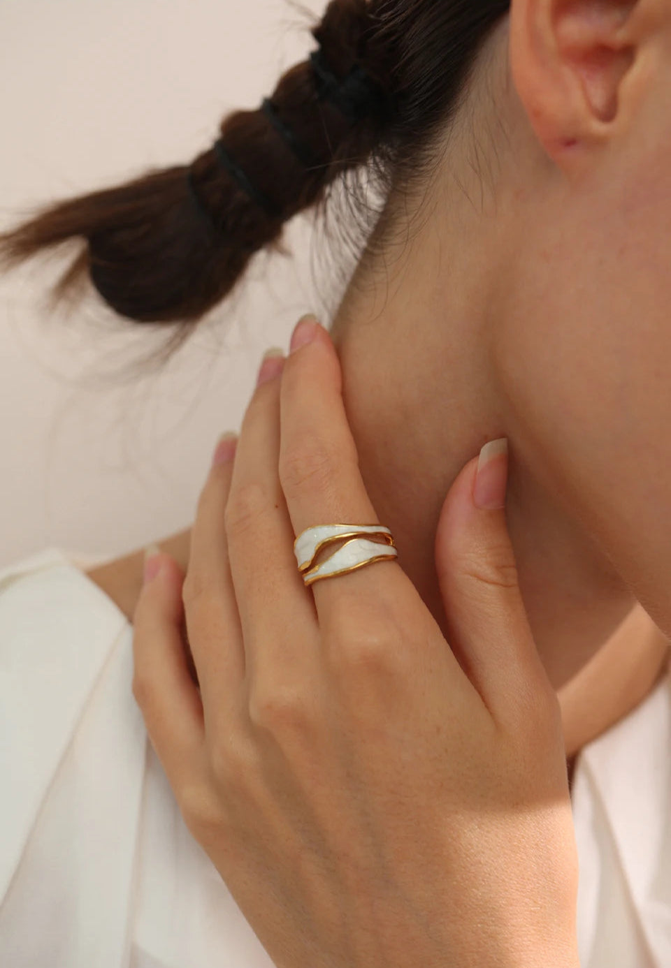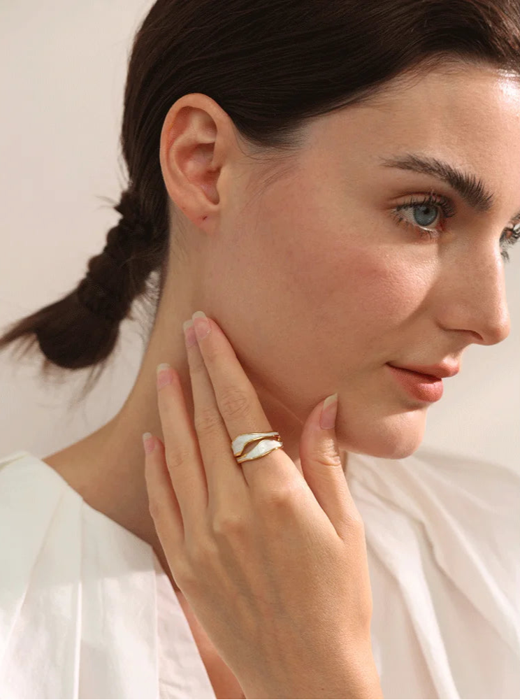 A forma do Anel Rivage é a linha fluida da costa, onde o esmalte branco encontra o metal dourado. Um design orgânico cujas curvas não seguem regras, apenas o instinto do movimento. É uma peça escultural que celebra o contraste: a força do metal e a serenidade do branco, a precisão do design e a liberdade da forma. Uma joia feita para celebrar a sua força e a elegância de seguir o seu próprio fluxo.
