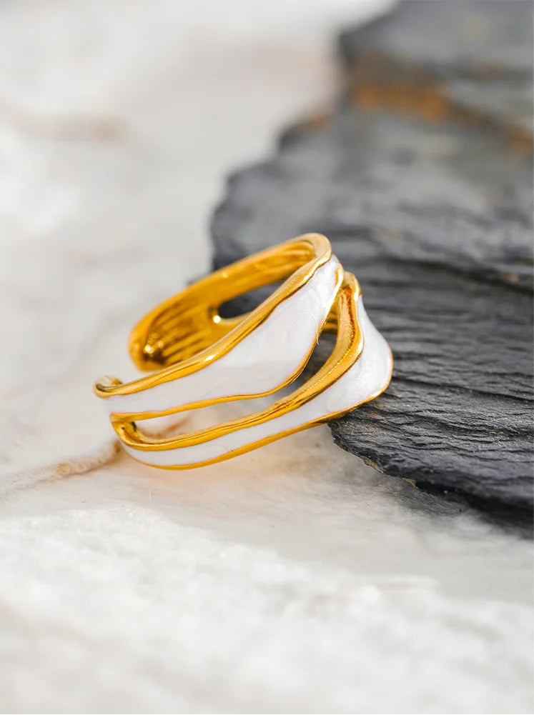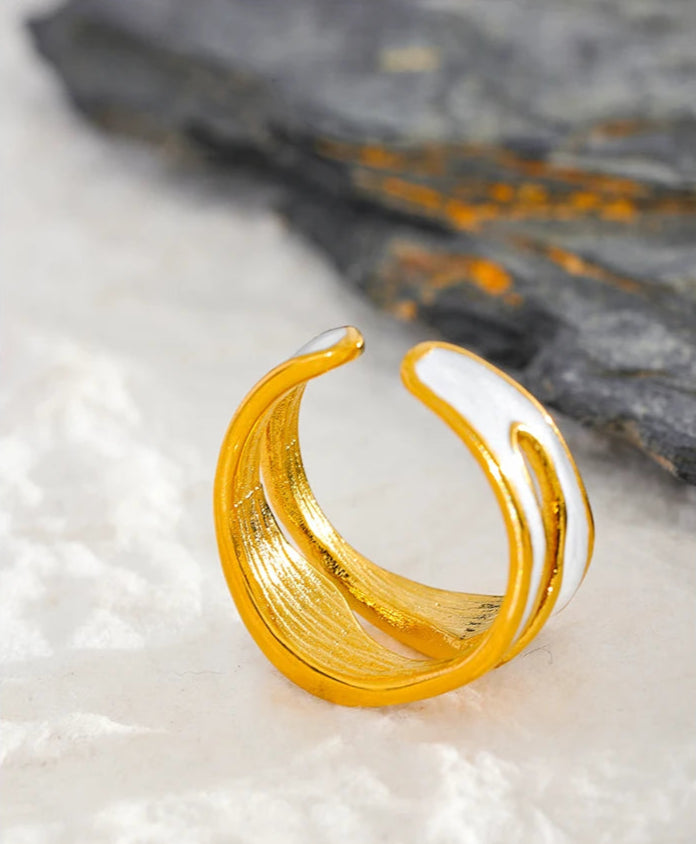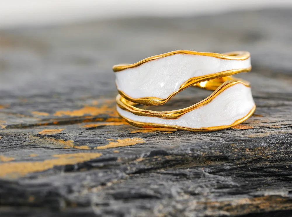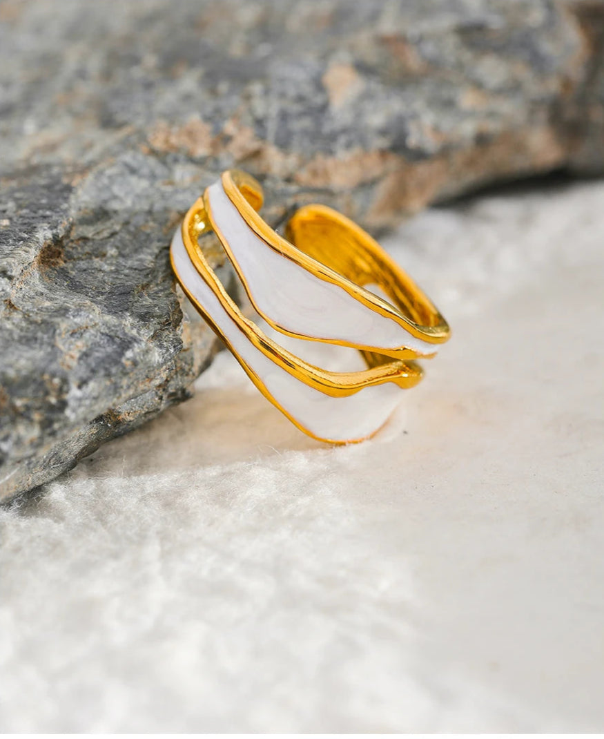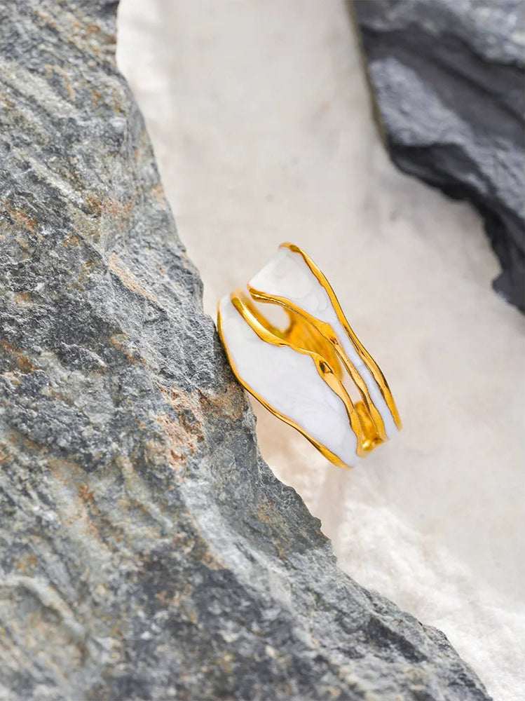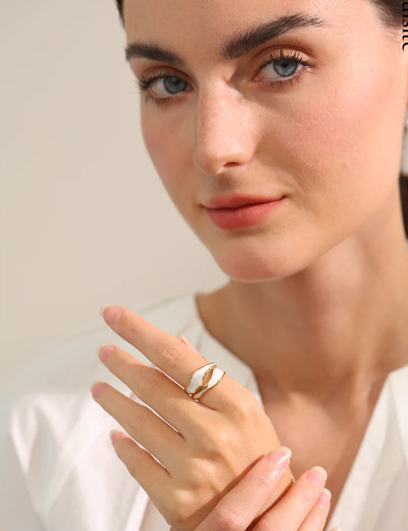 A forma do Anel Rivage é a linha fluida da costa, onde o esmalte branco encontra o metal dourado. Um design orgânico cujas curvas não seguem regras, apenas o instinto do movimento. É uma peça escultural que celebra o contraste: a força do metal e a serenidade do branco, a precisão do design e a liberdade da forma. Uma joia feita para celebrar a sua força e a elegância de seguir o seu próprio fluxo.